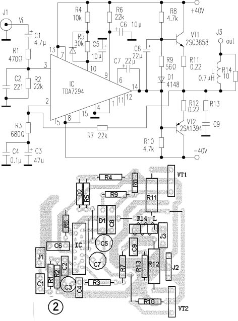 电路如图1所示,推动级采用了意法(SGS-THOMSON)公司的新品TDA7294,该芯片内部推动级和输出级均使用了DMOS场效应管,用±40V供电,输出功率可达70W(RMS/8Ω)、低失真(0.005%),音色细腻、听感极佳,乃近年来屈指可数的优秀芯片。功率输出VT1、VT2采用山肯大功率对管2SA1394、2SC3858(VCM=200V,ICM=15A,PCM≥200W,fT=30MHz)。电路原理如下:信号经C1、R1输入IC正相输入端③脚。R7和IC第②脚的R3、C3、C4构成负反馈网络,本放大器的闭环增益约34倍。⑨、⑩脚分别是待机、静音端,由于第⑩脚R、C网络时间常数比第⑨脚大,使得开关机均在静音下进行,避免了开关冲击声,C7为自举电容。