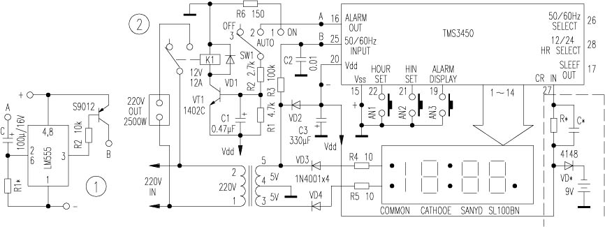 因为LED数字钟的走时精度决定于电网频率的精度,目前国内电网已大范围联网,其频率波动很小,所以,凡用电网工频交流电作频率源的电子钟其日误差量也是相对稳定的。笔者邮购的E型LED时控钟(原理图见图2)在四川内江地区较长时间的测试,其日误差约为70秒,且多为正误差,即每天快70秒。图1电路的作用就是让加装此电路的钟每天少走一定的时间,如少走70秒,用以抵消该钟的日误差。在图1中,由时基电路LM555和电容C、电阻R1组成延时电路,将三极管S9012作为控制开关使用。附加电路一共引出“+”、“-”、“A”、“B”四根连线,分别接到钟电路直流电源的“+”、“-”和“定时输出”、“50Hz输入”(对应于TMS3450集成电路的{15}、{20}、{16}、{25}脚)的四个端点上。平时“A”端为低电平,时基电路{2}、{6}脚通过电阻R1接电源负为低电平,{3}脚输出高电平,使三极管S9012的e、b极同为高电平,e、c极开路,50Hz信号正常进入钟电路进行分频,时钟正常走时;当每天一次的定时时刻(如果使用者未专门预置定时时间,此钟通电就会自动预置于中午12:00)到来时,时钟电路{16}脚(即“A”点)电平由低变高,给电容器C充电,LM555的{2}、{6}脚变为高电平,{3}脚变为低电平,S9012三极管ec极导通,50Hz交流信号源被短路,钟电路没信号分频,停止走时,屏显缺笔划。待电容C两端电压充到大于电源电压的三分之二(即电阻R1上的电压小于电源的三分之一)时,时基电路翻转,{3}脚电平由低变高,三极管由导通变截止,50Hz信号继续输入时钟电路,时钟恢复正常走时。改变电阻R1的数值,即改变了三极管的导通时间,也就是改变了时钟停走的时间,如果调整电阻R1值,使时钟停走时间接近或等于该钟原来每天多走的时间,可使该钟的日误差减到最小甚至为零,以达到自动调时的目的。