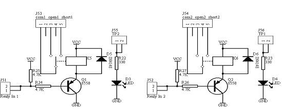 系统板上提供了2路继电器控制模块,分布在系统板的最左上端区域中,输入信号由Realy in 1和Realy in 2端口输入分别控制两路继电器,继电器控制的信号分别由最上端的两个插针输入和输出。分别称为“com1  open1  short1”,“com2  open2  short2”,由于这个两个继电器是单刀单掷控制,当继电器不吸合时,“com1”和“short1”相通,“com2”和“short2”相通;当继电器吸合时,“com1”和“open1”相通,“com2”和“open2”相通。其电路原理图1.1所示: