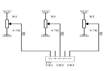 此模块主要是用于提供0-5V之间的可变的模拟电压值,即可以作为参考电压源也可以作为模拟电压信号。这三路是相互独立的。分别对应着由VR1,VR2,VR3端口输出。具体的电路原理图如图1.3所示:
