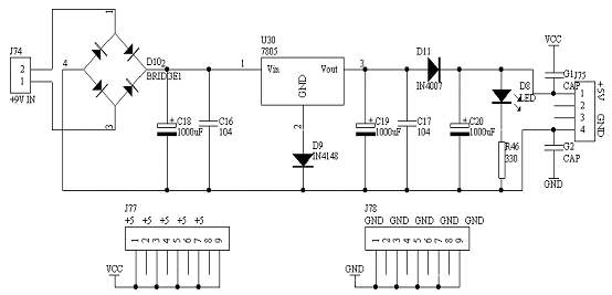 电源模块为系统板上其它模块提供+5V电源,电源输入有两种方式,一种为交直流电源从电源插座输入,输入的电压要求,直流输入应大于7.5V,交流输入应大于5V,通过7805三端稳压器得到5V的直流电源供给系统其它模块工作,另一种为从USB接口获取+5V电源,只要用相应配套的USB线从电脑主机获取+5V直流电源,在电源模块中加有保护电路,即电路中有短路,不会对7805三端稳压器及电脑主机电源有损害!其电路原理图如图1.4所示:
