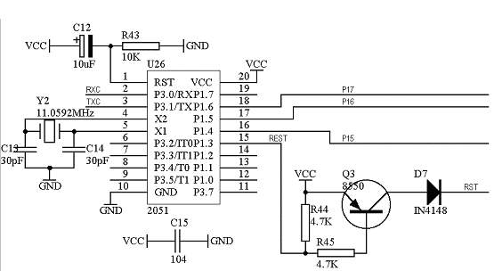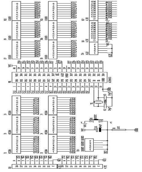 该系统板上的单片机系统把全部的I/O端口资源提供出来,因此,在实际应用的时候,可以灵活地组合成不同的单片机应用系统,该单片机采用12MHZ晶振,具体的电路原理图如图1.17所示: