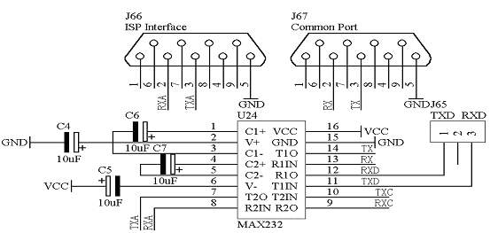 232电平转换采用MAX232芯片把TTL电平转换成RS-232电平格式,可以用于单片机与微机通信,以及单片机与单片机之间的通信,在该系统板上提供了两个DB9的接口,其中一个用ISP下载器模块的程序下载接口,称为“ISP Interface”,另一个接口为单片机与其它具有RS232接口的通信端口,称为“Common Port”。具体的电路原理图如图1.6所示: