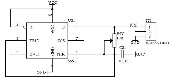 该模块采用555芯片产生一些连续频率的方波信号,由“WAVE GND”端口输出,其稳定可调的频率范围在5KHz-100KHz之间变化。电路原理图如图1.7所示: