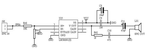 该音频放大模块采用LM386芯片作为音频的功率放大,音频信号由“SPK IN”端口输入,信号的输出由“SPK OUT”端口输出,只要在“SPK OUT”接一个喇叭即可。具体的电路原理图如图1.8所示: