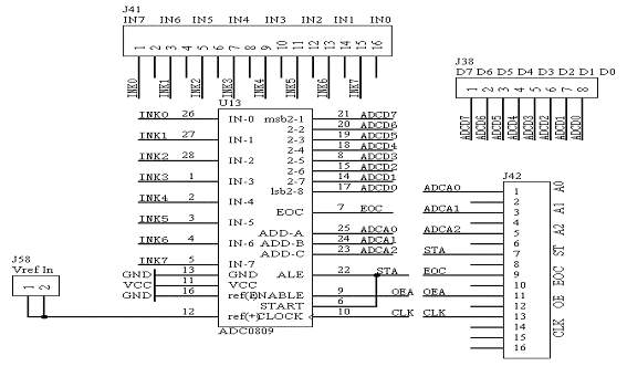 系统板上的模数转换模块采用ADC0809芯片,组成8路8位的A/D转换,8路模拟电压的输入由IN0-IN7的端口输入,控制ADC0809芯片工作的控制信号由“CLK OE EOC ST A2 A1 A0”端口输入,转换的数据从D0-D7的端口输出。具体的电路原理图如图1.9所示: