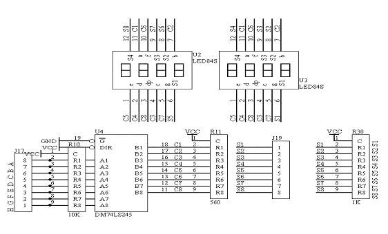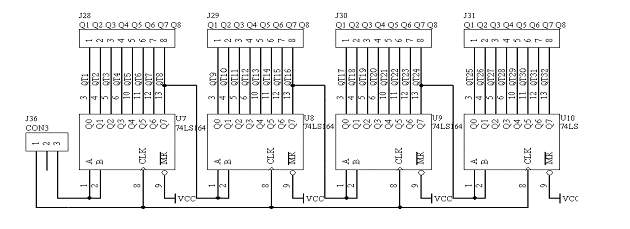 该系统板上采用了四个74LS164(移位寄存器)作为串并转换模块,这四路串并转换模块已经级连起来。串行数据从“RXD TXD”端口输入;具体的电路原理图如图1.15所示: