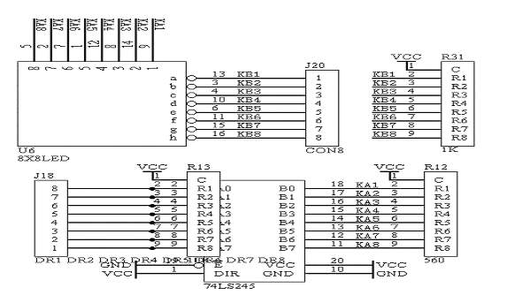 该系统板上提供了8X8点阵模块,用于理解单片机是如何控制点阵数码管的工作过程,它有两个输入控制端口,对于点阵数码管有行和列之分,这两个端口分别控制它们的行和列,“DR1-DR8”为8X8点阵模块的行信号控制端口,“DC1-DC8”为8X8点阵模块的列信号控制端口。具体的电路原理图如图1.12所示: