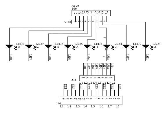 该模块采用8个发光二极管作为指示信号作用,即可以用排线来控制,也可以单个地控制每个发光二极管的亮灭,当控制信号为低电平时,发光二极管亮,为高电平时,发光二极熄灭;控制电平的输入由“L1-L8”输入。电路原理图如图1.13
