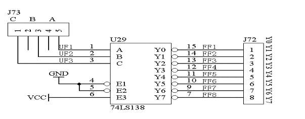 在系统板上提供了三八译码模块,控制译码器译码信号由“C B A”端口输入,译出的控制信号由“Y0-Y7”输出。电路原理图如图1.14