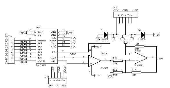 系统板上的数模转换模块采用了8位的D/A转换芯片DAC0832来完成数模转换过程,DAC0832是电流输出型D/A转换芯片,因此,后面接有集成运放LM358来完成电流到电压的转换。其中的数字信号的输入从“D0-D7”端口输入,控制DAC0832工作的控制信号由“WR CS”端口输入,模拟量的输出从“AOUT”端口输出,由于LM358工作在双电源条件下,因此要给LM358加入±12V电压,从“+12V GND -12V”端口加入。具体的电路原理图如图1.16所示: