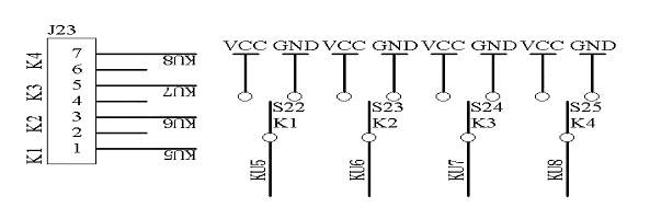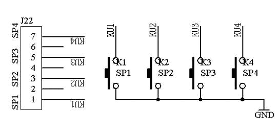 键盘是人机通信不可缺少的部件,独立式键盘是最基本的一种键盘方式,在本系统中提供了四个独立式按键;具体的电路原理图如图1.22所示: