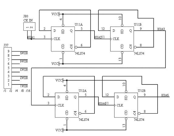 该系统板上的分频电路采用2片74LS74来完成最大16分频,输入的时钟信号由“CK IN”端口输入,经过2片74LS74分频后的信号分别由“/1 /2 /4 /8 /16”端口输出,分别表示未分频,2分频,4分频,8分频,16分频;具体的电路原理图如图1.19所示