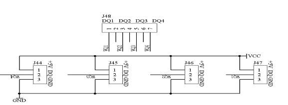 为了适应新技术的需要,增加1-Wire总线接口,在本系统板上提供了四路1-Wire总线接口,数据传输通过“DQ1 DQ2 DQ3 DQ4”端口来完成;具体的电路原理图如图1.20所示: