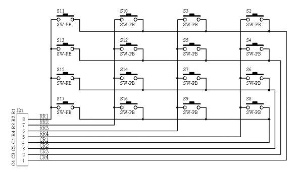 行列式键盘也即矩阵式键盘,它由行和列组成,在每个行列的交叉点上放置一个按键,这样4×4行列式键盘共需要16个键盘组成;具体的电路原理图如图1.23所示: