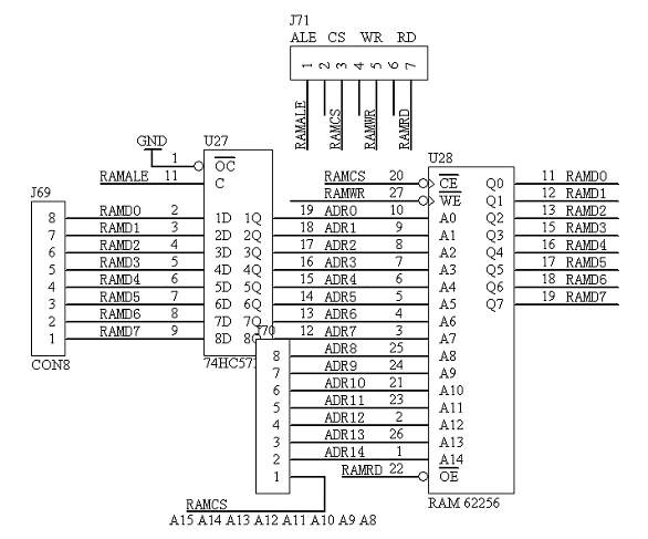 为了适应大容量的数据处理的需要,在系统板上加入了32KB数据存储器(RAM),数据总线从“D0-D7”的端口输入,高8位地址总线从“A8-A15”端口输入,控制数据存储器的读写控制信号从“ALE CS WR RD”端口输入,具体的电路原理图如图1.24所示: