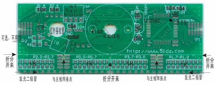 6、贴片电阻、红外发射管、红外接收管、插针、二极管、电阻、电容等配件:大家从图上看到的板上安装的元件,我们的红处接收管采用高灵敏的方型接收管。电路板有*号的地方,表示可大可小,需要在实际应用中根据不同的效果来决定,而K1K2等一些位置,即原理图中没有的位置,不需要安装,但是可以给高级用户扩展功能使用(例如可以短路设定成另一种显示模式;例如显示时间,例如增加遥控功能等等,留给自己扩展发挥的功能请不要问我们,那是我们不提供的功能,必须由用户自己创造!)。