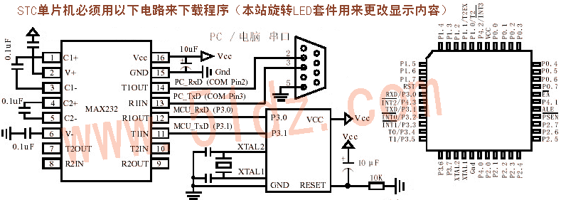对于没有购买本站单片机开发板的用户,如果你有了别站的单片机开发板,板上有串口通信电路,按下图接线就可以下载!实在是没有的,那就需要自己买个MAX232组装一个电路再下载,下载器的安装图如下: