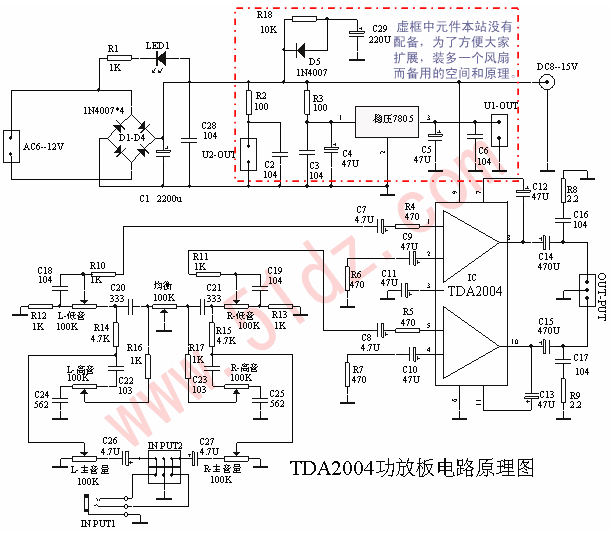 此汽车功放套件功放IC:TDA2004,功放板采用电脑设计,元件分布美观合理,板上自带整流器,可以直接输入交流电,也可以直接输入直流电。输入输出采用和电子实验套件相兼容的插针,扩展方便。本板使用方便简单,接上音箱、CD、VCD、DVD、MP3、电脑和电源即可工作。有音量控制、高音控制、左右声道均衡控制,采用全新正品元件。 本站有对应的光板和成品板销售,请在相关页面查找。 五一电子长期为大家提供实践动手的机会,想体验亲自动手装功放的朋友,请赶紧采取行动。 TDA2004也可用TDA2005或TDA2009代换。音响自装,成就自我。